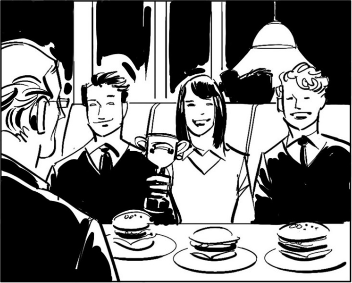 Thug eagraithe (ag-ra-tha) na díospóireachta (debate organisers) cuireadh (invitation) den fhoireann dul le haghaidh (hi) béile. Bhí burgair acu go léir le hithe.