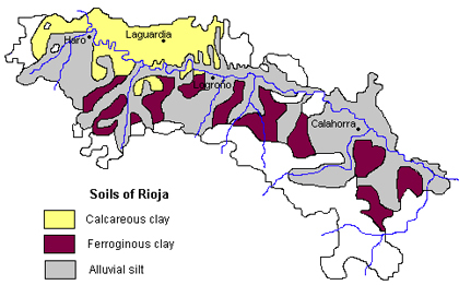 Bodem van kalkhoudende klei (Rioja Alavesa, en soms ook rijk aan ijzer, in Rioja Alta). Rioja Baja heeft meer alluviale bodems