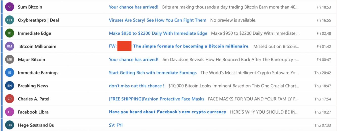 Above is a screenshot from a honeypot mailbox we use to collect spam and malicious emails. You can see the scale of the unsolicited spam emails we have received, with the majority being bitcoin-based, trying to get recipients to sign up to different cryptocurrency exchanges or buy into schemes to make them millions! Without further investigation, these emails would be classified as spam, but some could potentially be malspam.
