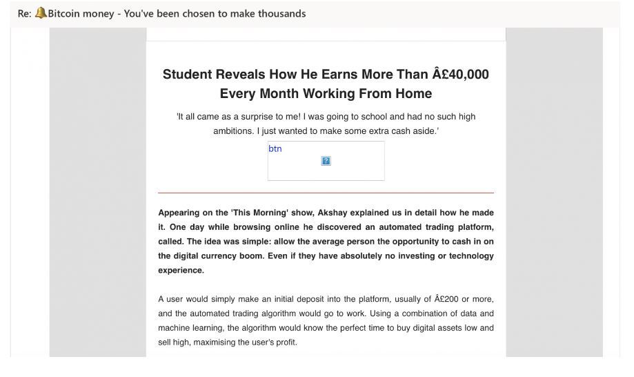 In this spam email the sender is promoting a cryptocurrency platform, and enticing the user to sign up and deposit money.