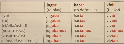 * Descriptions in the past (what someone or something was like or was doing) – e.g. En mi escuela primaria, las instalaciones eran mejores. In my primary school, the facilities were better.