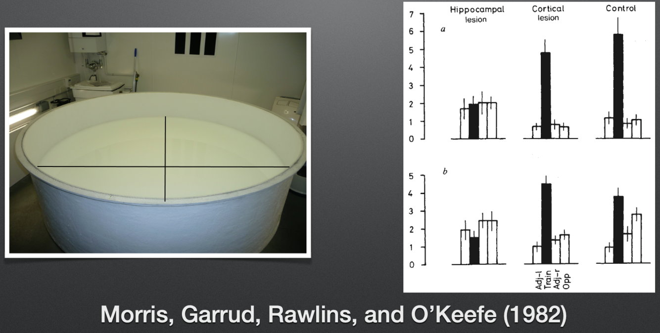 because they found the hippocmapal lesioned n were fine learning about a platform location using landmark cues however struggled learning the location using a wider cogntiive map of the environment
