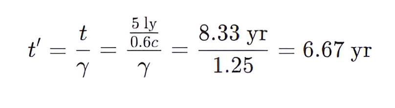 In the reference frame of the Earth, the time interval is Δt’ = (5 ly)/(0.6c).
