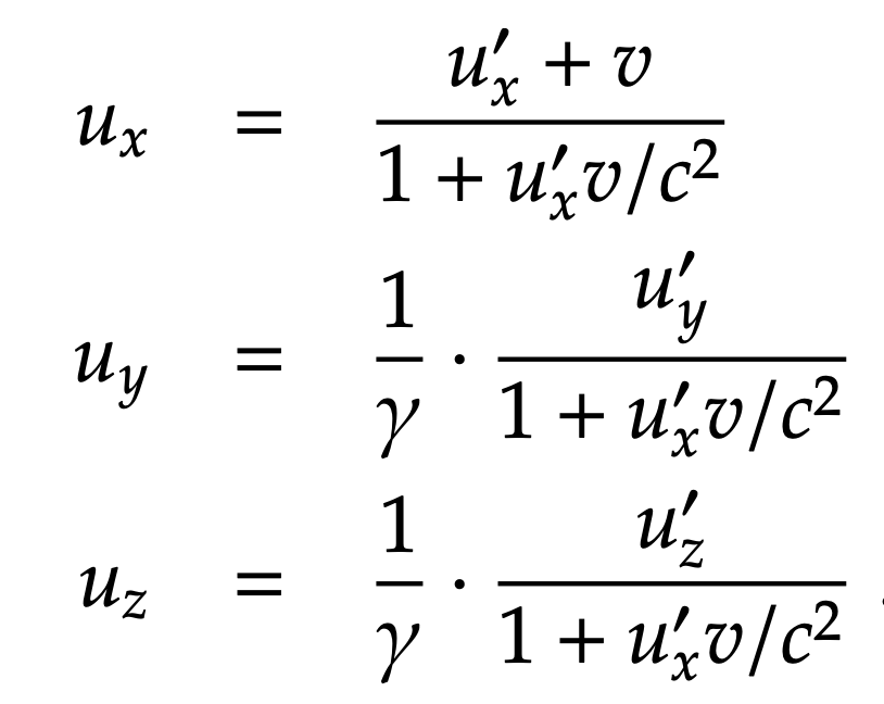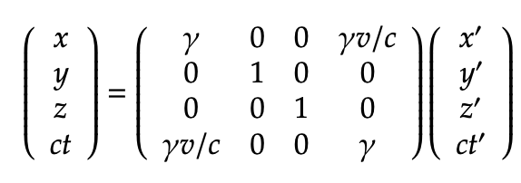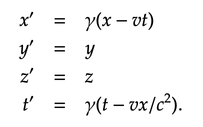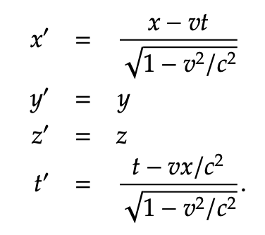 Note that x,y,z and t can be swapped for x’,y’,z’ and t’ and the velocity’s sign changed for the transformations the opposite way.