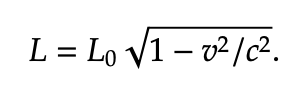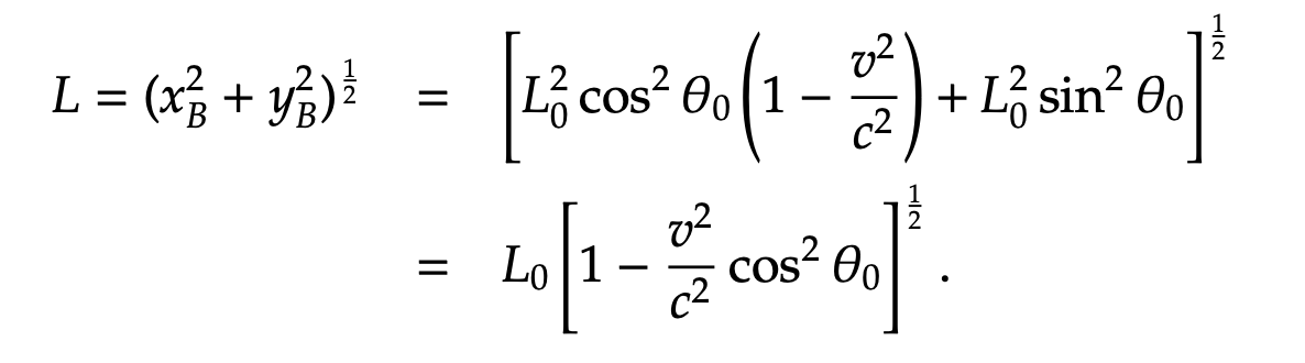 Give an equation for L, the length of a moving object which is moving at an angle to the x-axis