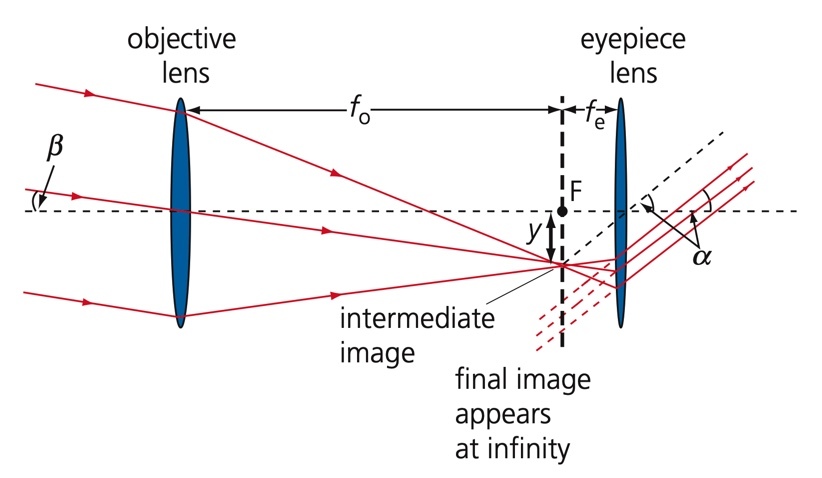 give an equation for magnification with reference to the focal length of the eyepiece and objective lense