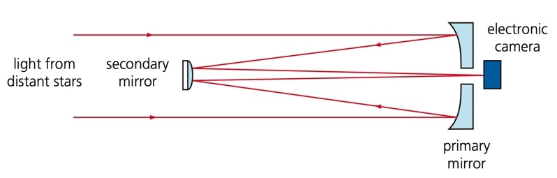 draw a diagram showing the cassegrain arrangment for a reflecting telescope