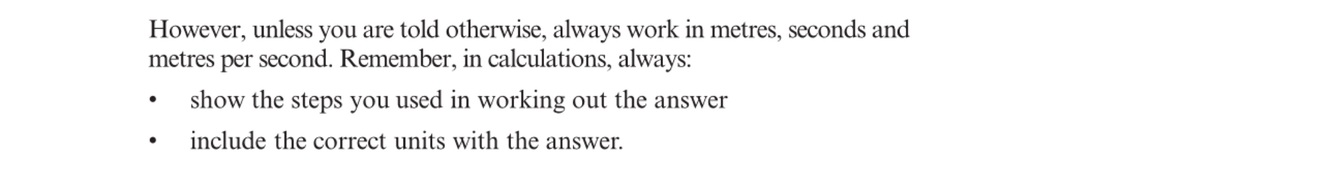 The worked examples use metres (m), seconds (s), and metres per second (m/s), but values can also be given in different units such as kilometres (km) and hours (h).