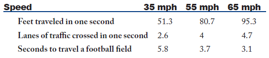 The following chart provides an indication of how fast a vehicle travels in one second at 35, 55, and 65 miles per hour.