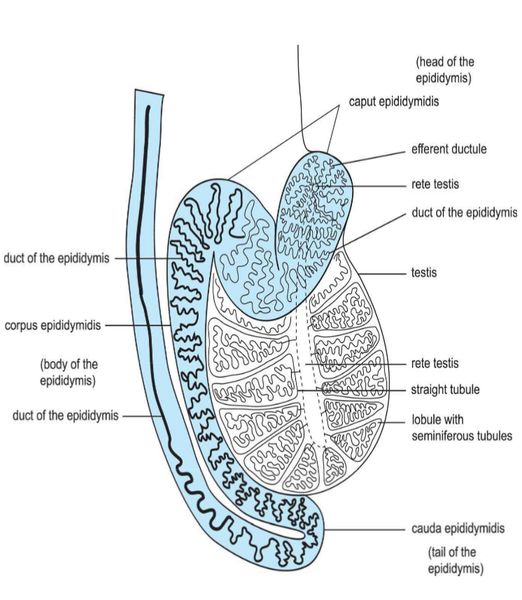 Seminiferous tubules → rete testis → efferent ducts → epididymis → Vas deferens