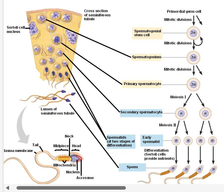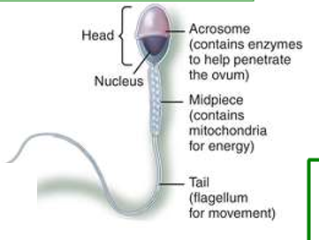 1) Tip nucleus covered with acrosome- enzyme penetrate ovum