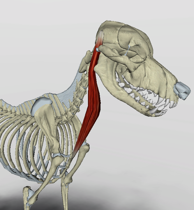 -pars mandibularis: manubrium -> onderkaak. Bij Bo pars zygomaticus (manubrium -> tuber fasciale van os zygomaticum+ mandibula) en pars mastoideaxpars basilaris(tub musculare van pars basilaris van os occipitale + proc. mastoideus -> manubrium).