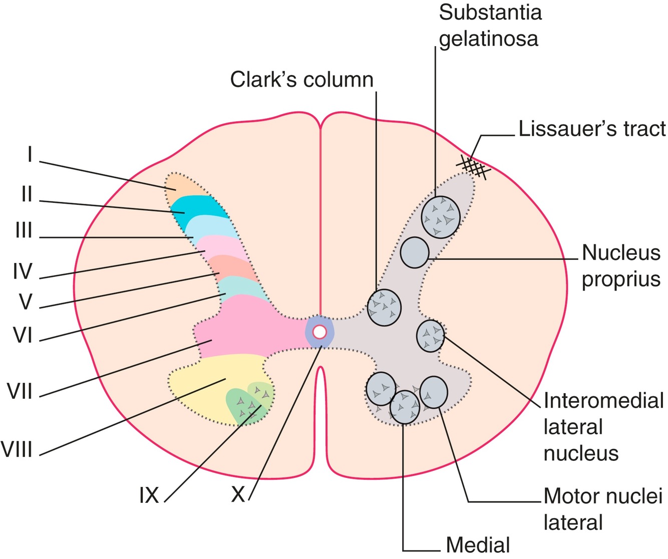 Gray matter can be further divided into 10 zones – Rexed’s laminae I-X