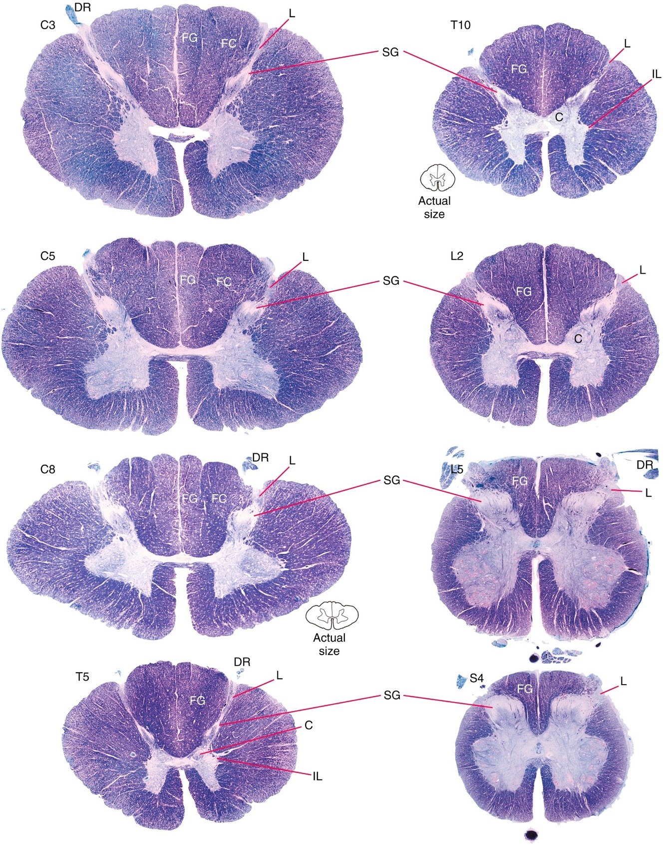 Cross-section of spinal cord at any level is roughly H-shaped – the H being formed by gray matter.