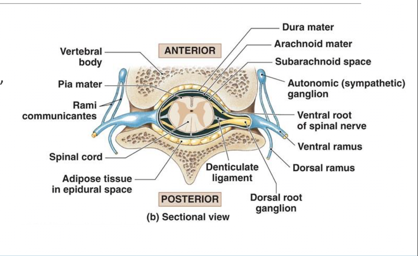 3. pia mater: innermost layer, delicate layer of elastic fibers and collagen that closer adheres to the spinal cord. Denticulate ligaments extend from the piamatter.