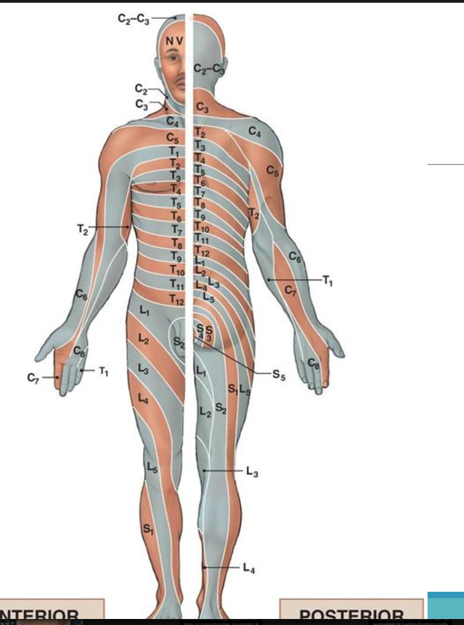 Because spinal nerves exit the spine laterally, dermatomes associated with the torso and core are distributed horizontally. When viewed on a body map, they appear like stacked discs.
