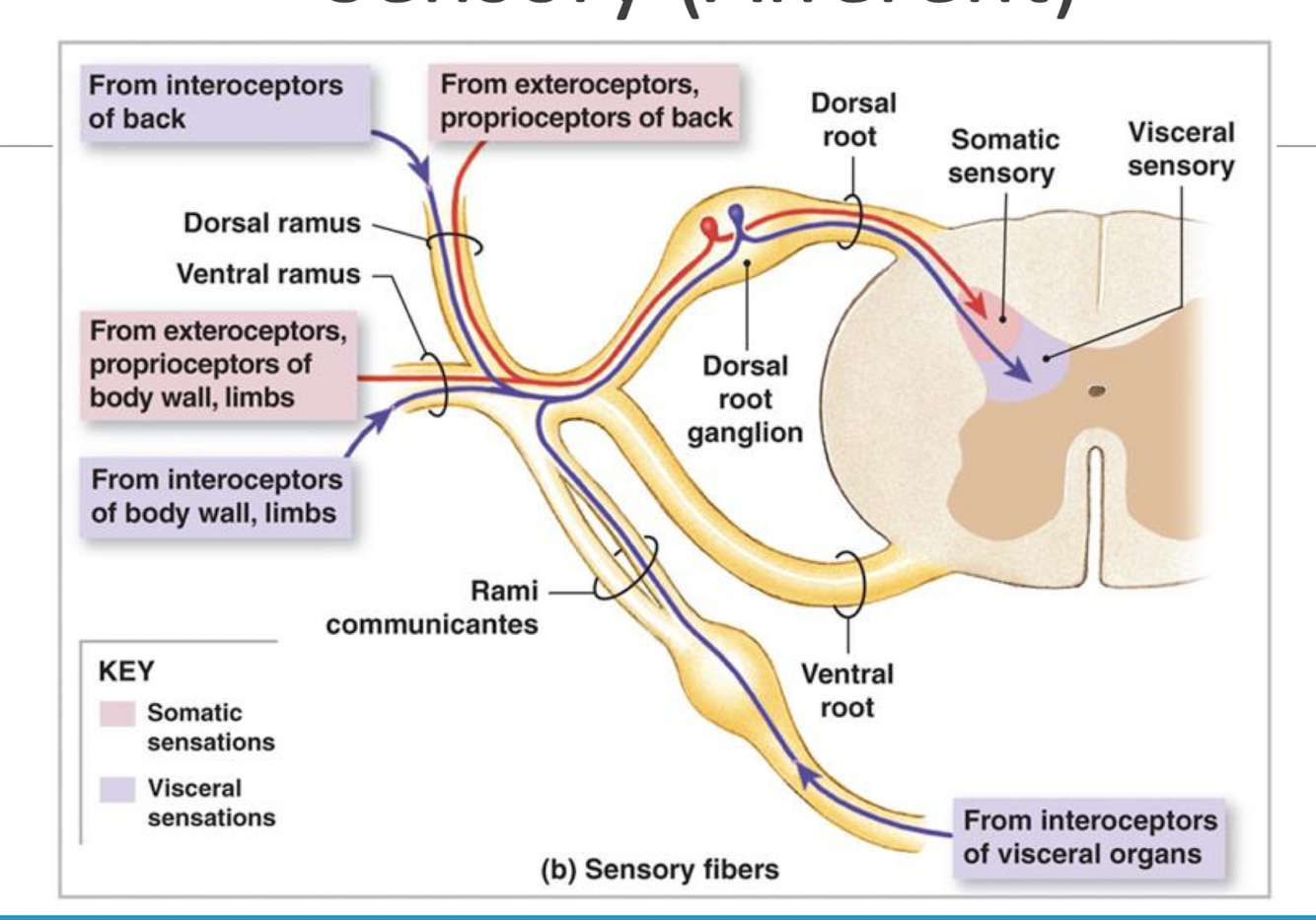 Ramus communicans (plural: rami communicantes): Small branches that connect the spinal nerves to the sympathetic ganglia of the autonomic nervous system, involved in transmitting autonomic signals, specifically sympathetic impulses, between the spinal cord and the peripheral nervous system. Sensory: from visceral organs, motor: sympathetic fibers of ANS