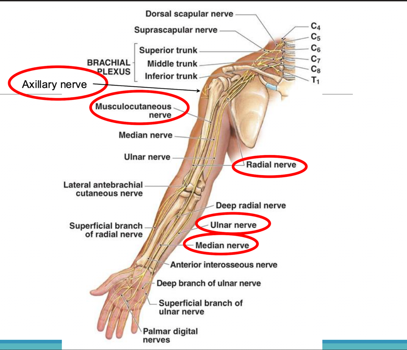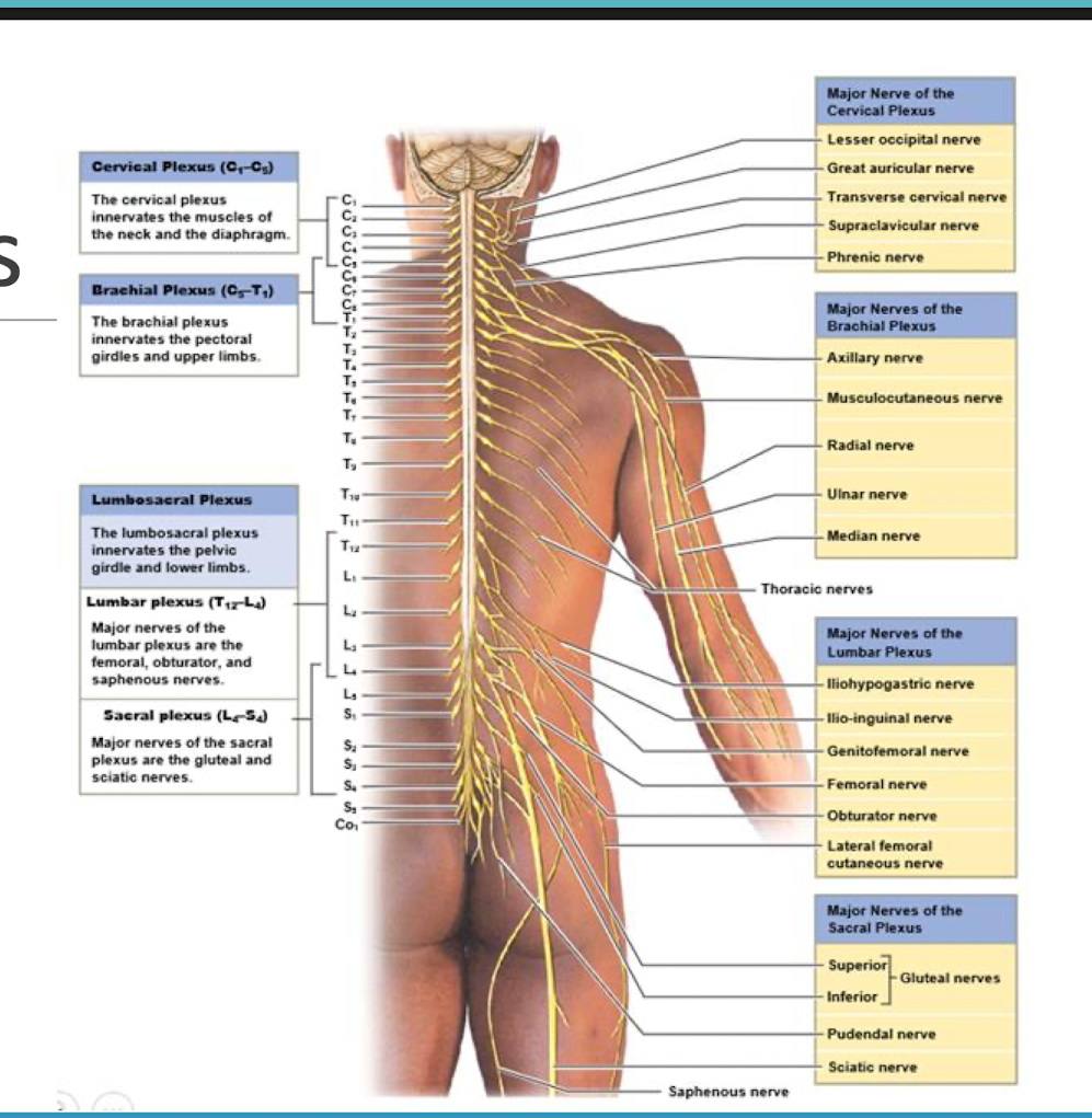A network of intersecting spinal nerves formed by the ventral/anterior rami of adjacent spinal nerves (remember dorsal rami innervate back). These plexuses allow for the redistribution of nerve fibers from different spinal nerves, resulting in the formation of peripheral nerves that contain fibers from multiple spinal levels. Plexus nerves primarily innervate the limbs, anterior and lateral parts of the trunk, and other associated structures