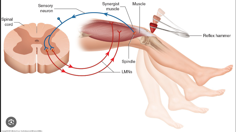 Example: The knee-jerk (patellar) reflex (monosynaptic), where tapping the patellar tendon causes the leg to extend.