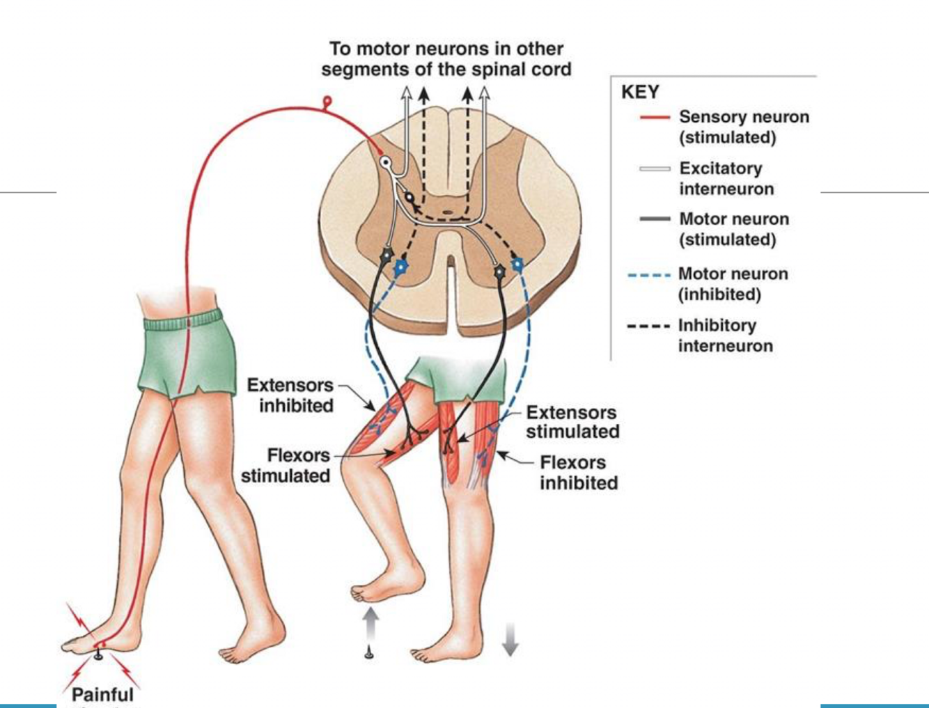 During a Reflex: When a reflex, such as the stretch reflex or withdrawal reflex, is triggered, sensory neurons send signals to the spinal cord. These signals not only activate motor neurons that cause the contraction of the agonist muscles but also activate interneurons that inhibit the motor neurons of the antagonist muscles.