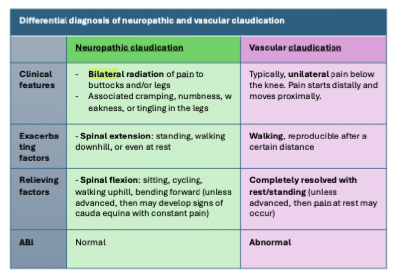 -Worse with extension* (prolonged standing)- narrows the spinal canal