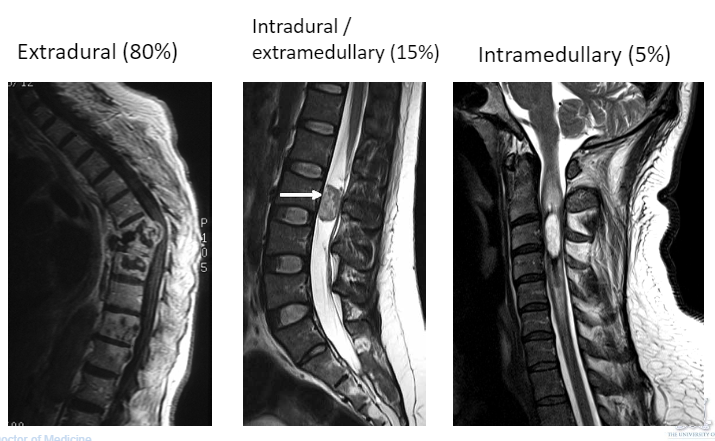 Recognise the appearance of extradural, intradural/extramedullary and intramedullary lesions which may compress the spinal cord and cauda equina. Which is the most common?