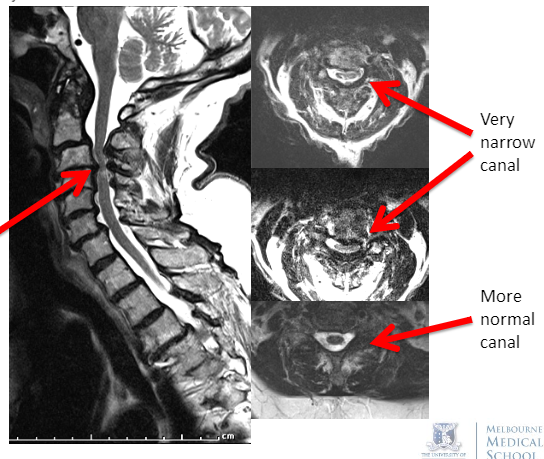 MRI: severe cervical canal stenosis with cord signal change due to disc prolapse, spondylosis and hypertrophy of the ligamentum flavum