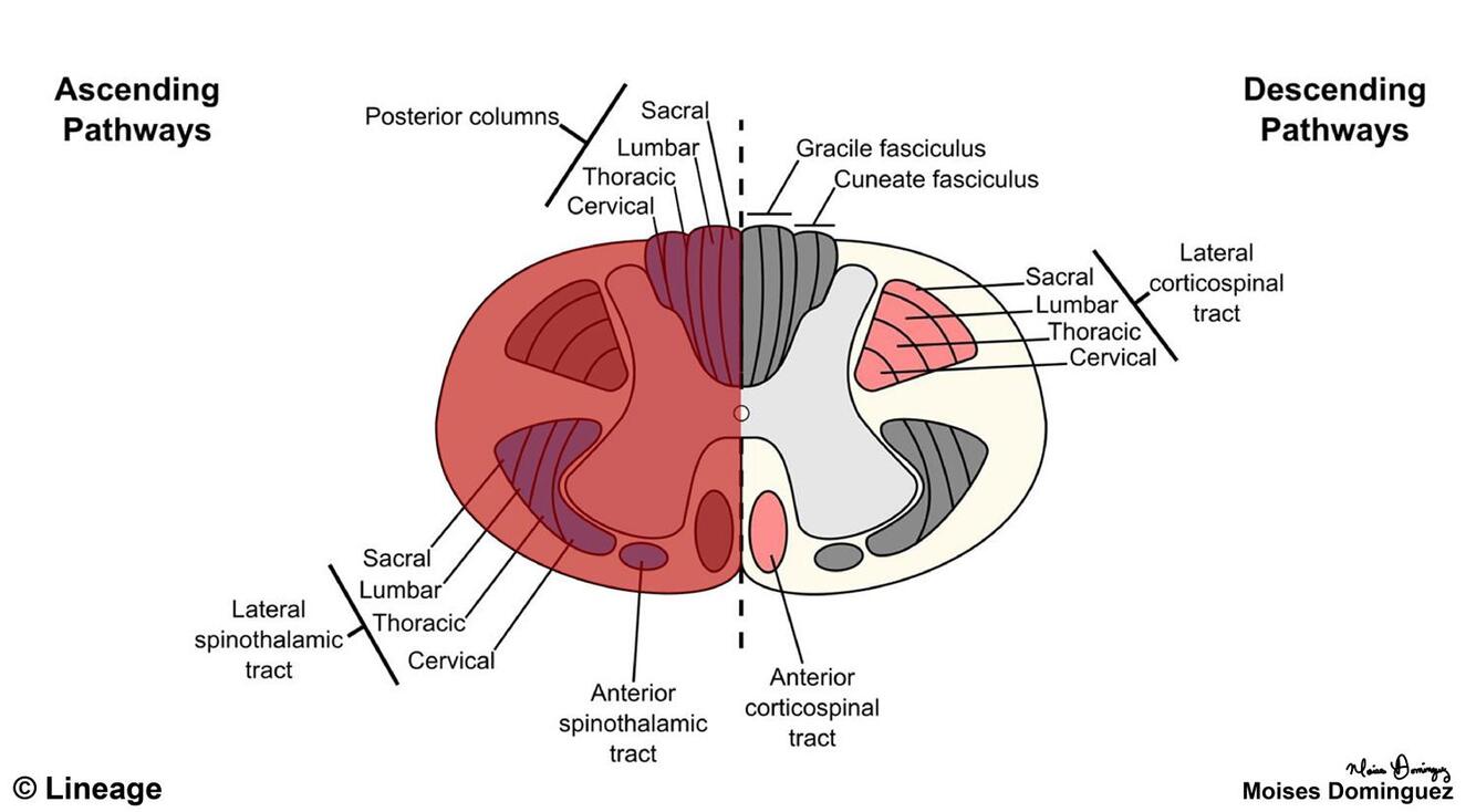 (spinothalamic dessucates at level of exit)