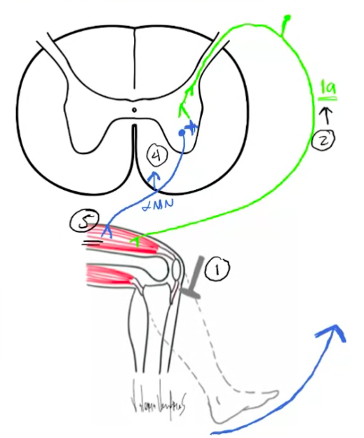 2. Muscle spindle receptors sense change in stretch (activation of muscle spindle) and increase firing of 1a afferent fibres to spinal cord (via dorsal horn)