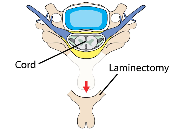 Removal of part or all of the lamina from affected vertebra