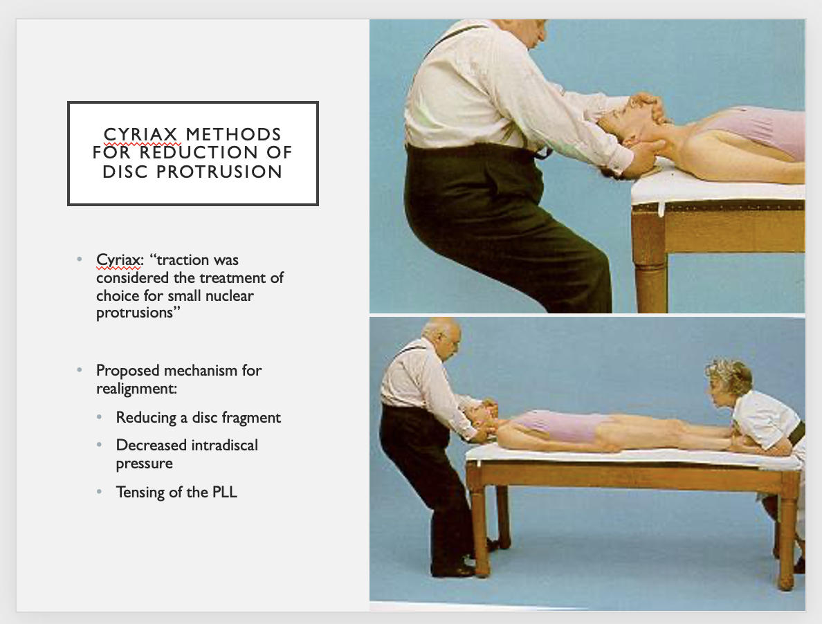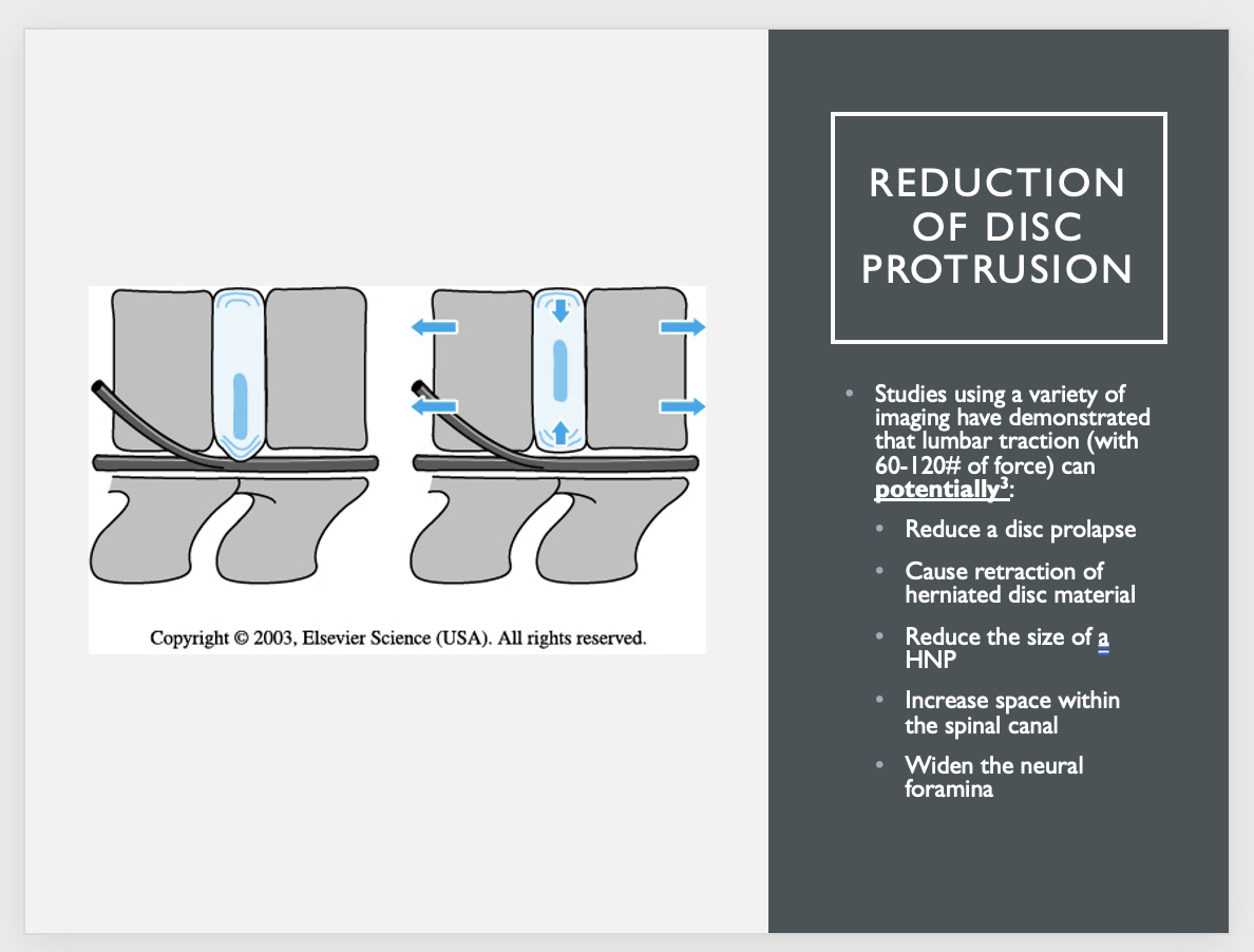 Reduction of disc protrusion, thus relieving compression on spinal nerves.