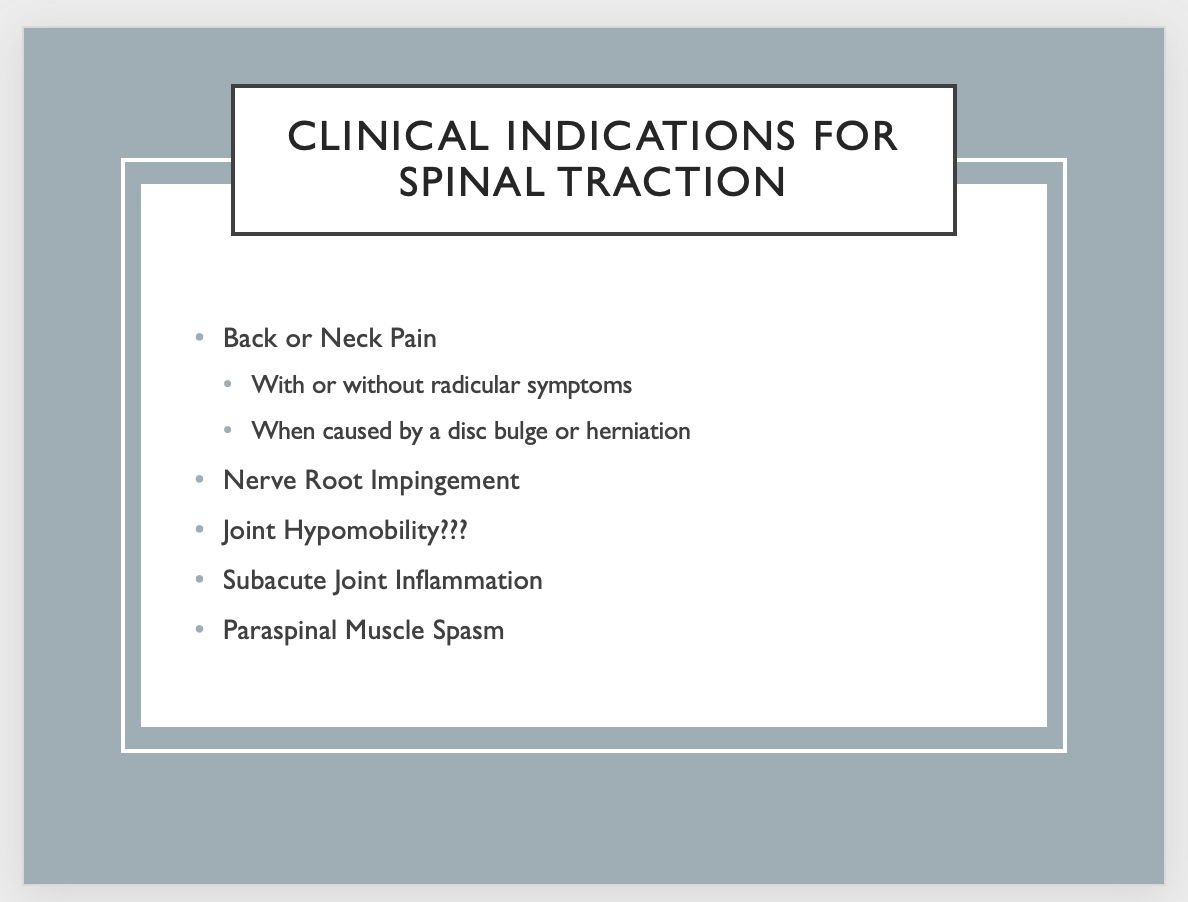 What are the clinical indications for using spinal traction?