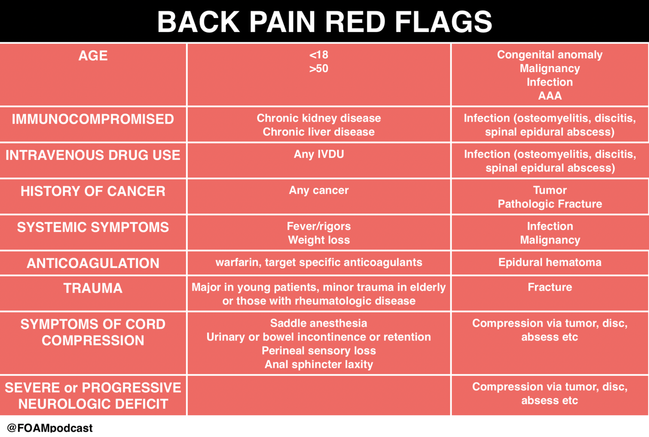 *NOTE: be concerned about age <18yrs and >55yrs. Be concerned about thoracic pain as thoracic spine is least mobile so unlikely to be mechanical.