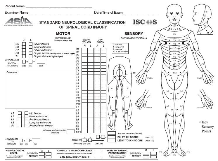 ASIA impairment scale (American Spinal Injury Association Impairment Scale). Divides spinal cord injuries into 5 categories: