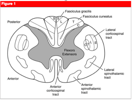 Patient with a flexion/compression injury and motor deficiet LE>UE. Diagnosis? Treatment? Outcome?