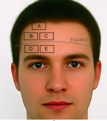Lateral 1/3 of eyebrow, below the equator (site D in figure)