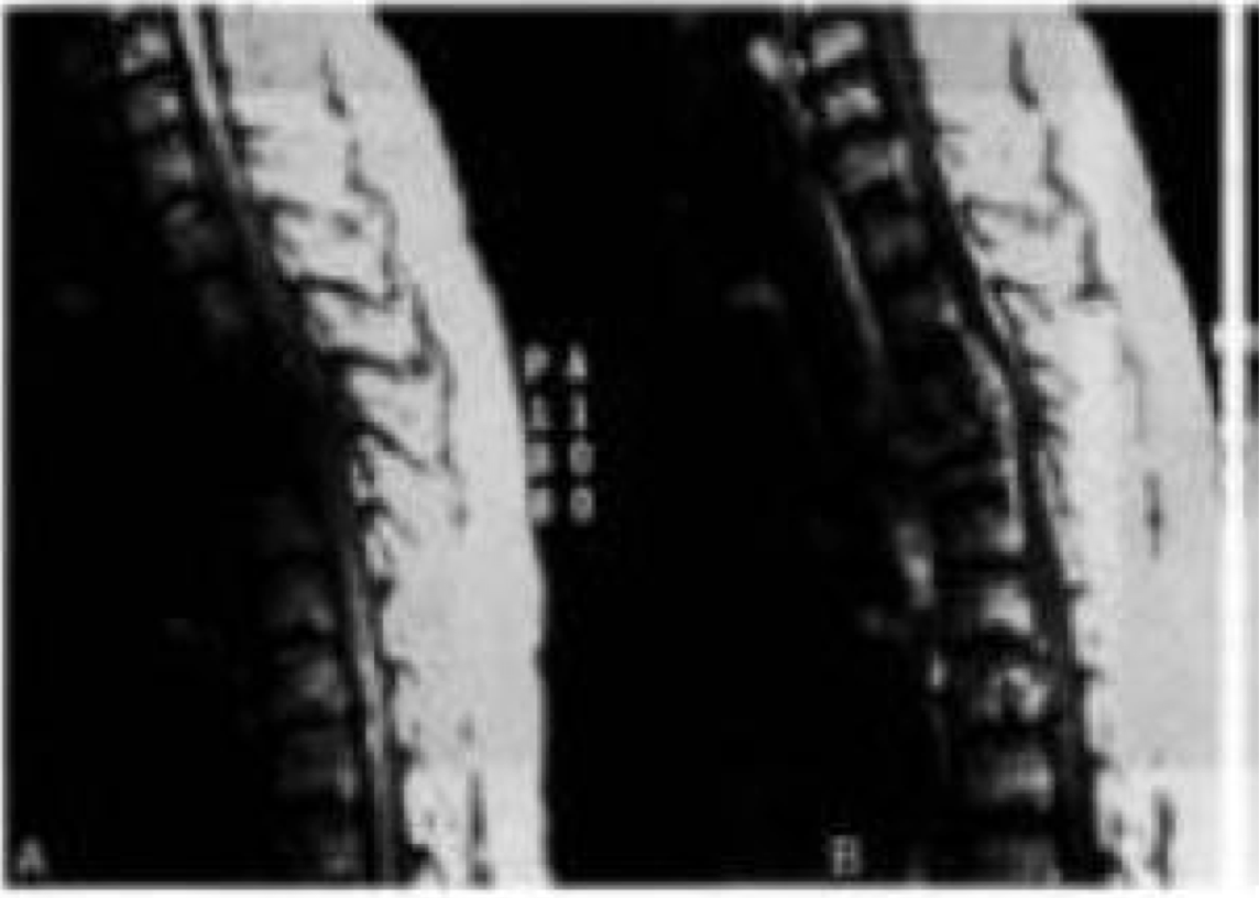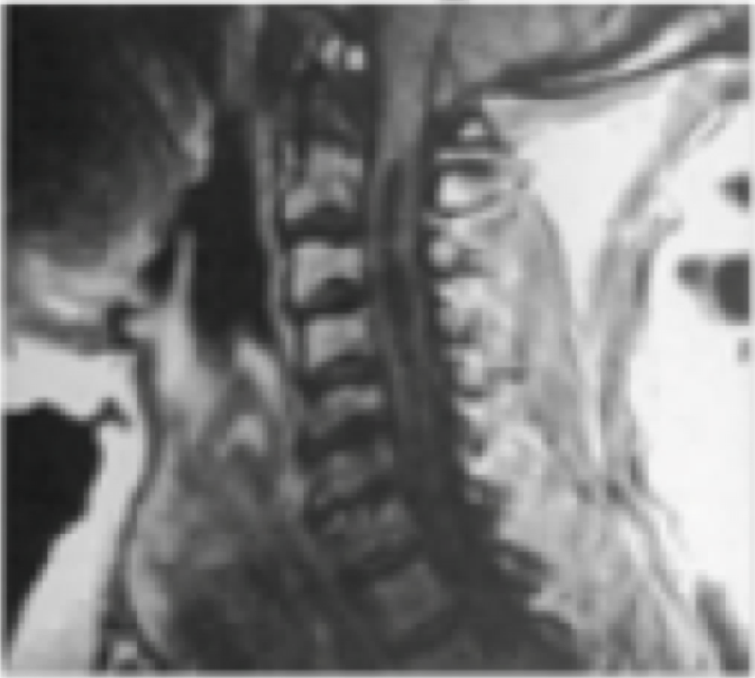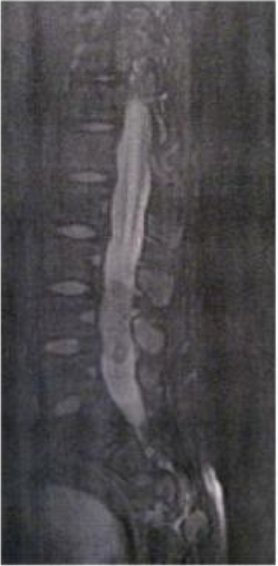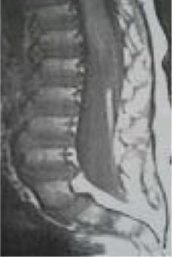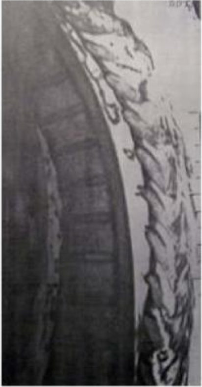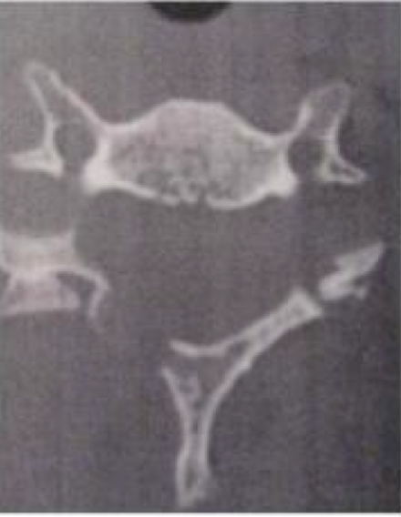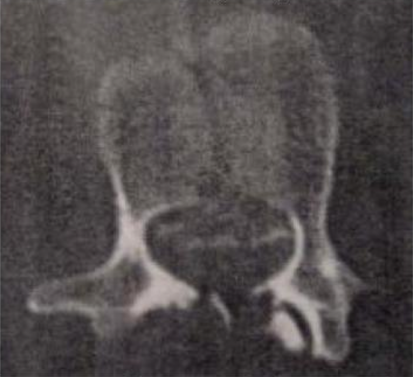 di antara ciri di bawah ini. manakah yang tidak berasosiasi dengan gangguan yang ditunjukkan pada CT Mielogram di bawah ini?