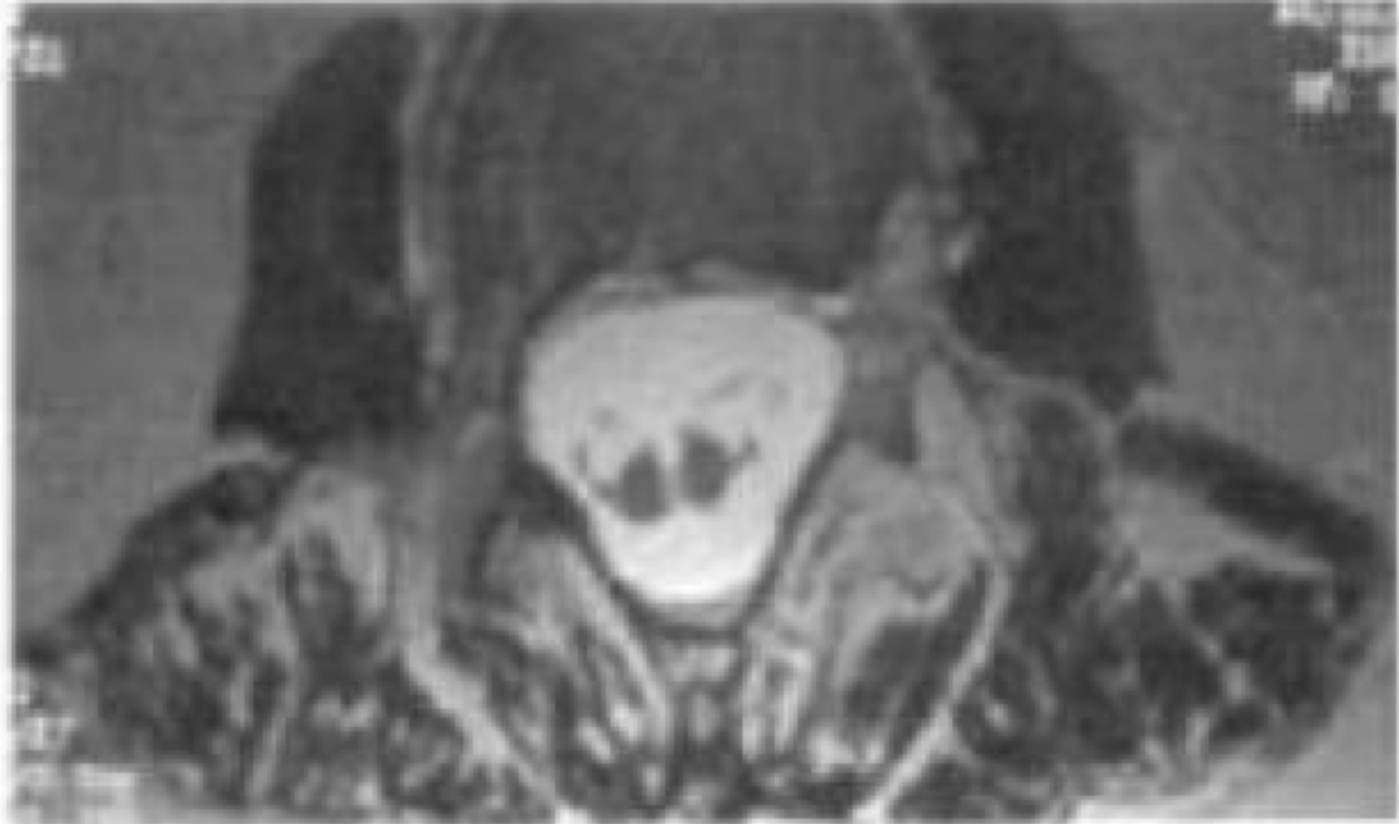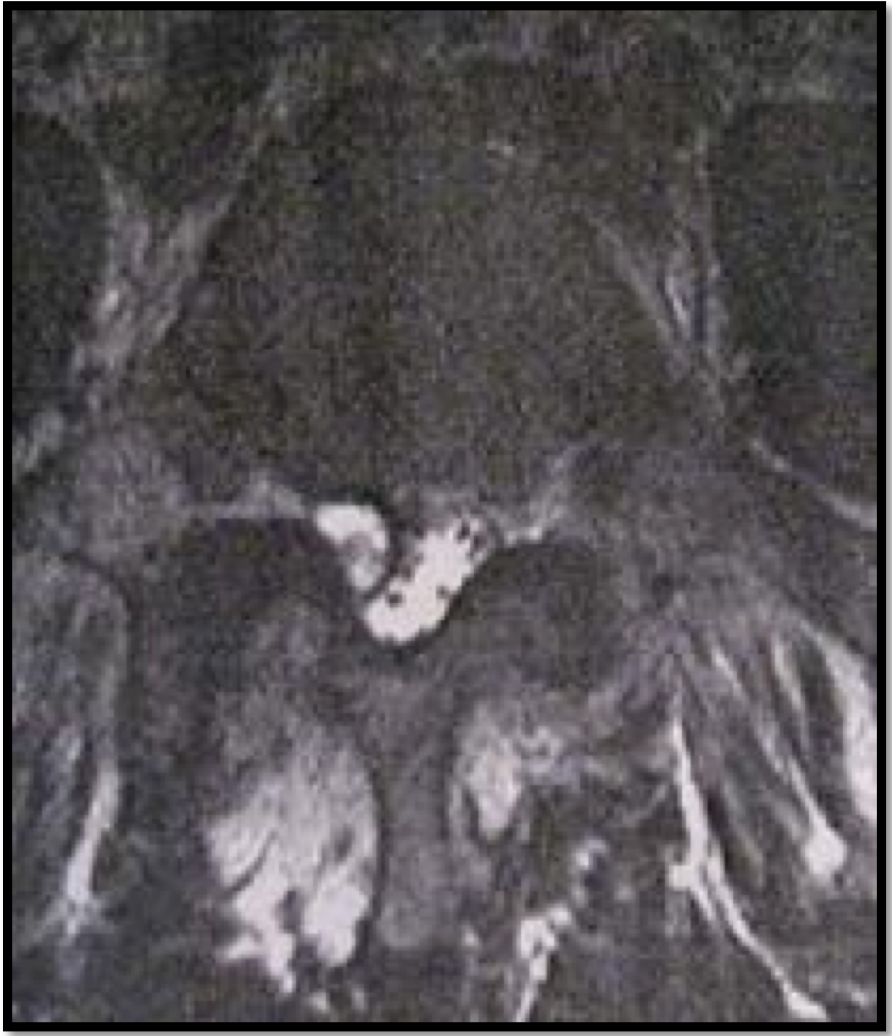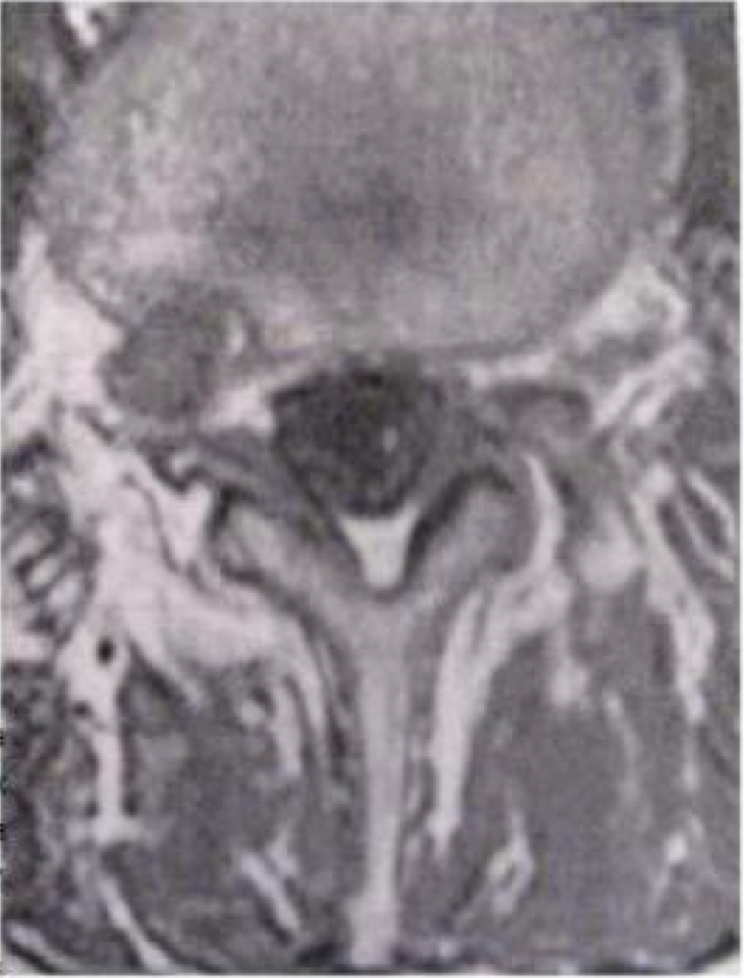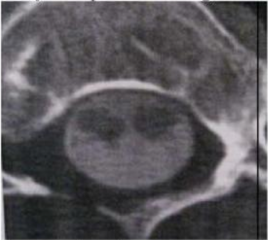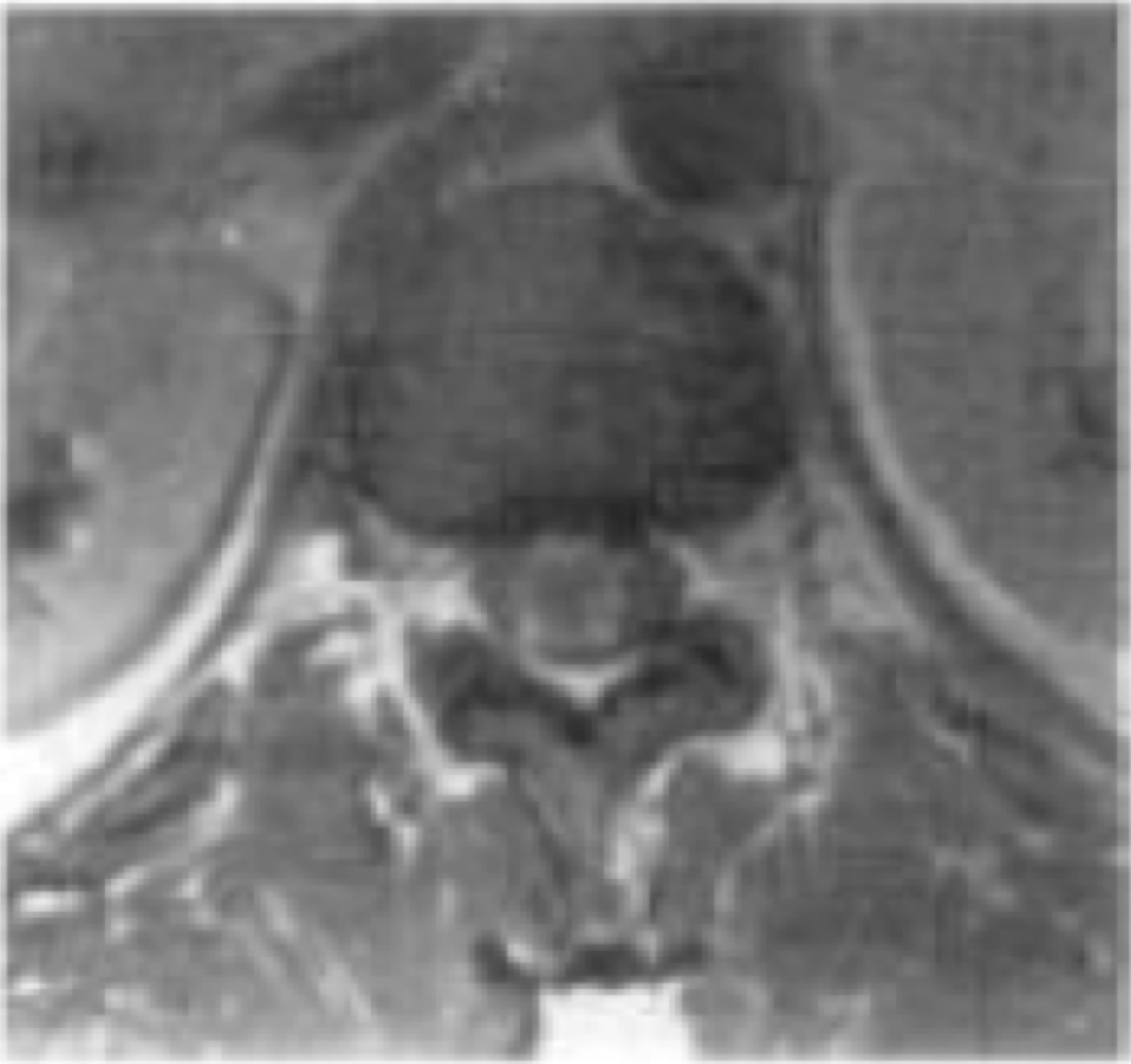 MRI T1-tertimbang dengan kontras aksial di bawah ini berlokasi di ruang piringan L3-4. struktur mana yang paling mungkin terkena kelainan yang ditunjukkan pada MRI ini?