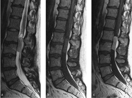 The MRI reveals a mass lesion below the conus medullaris that may be associated with either the filum terminale or a cauda equina nerve root. The lesion enhances homogeneously with contrast administration and the differential diagnosis includes a myxopapillary ependymoma, peripheral nerve sheath tumour such as a schwannoma or neurofibroma and meningioma.