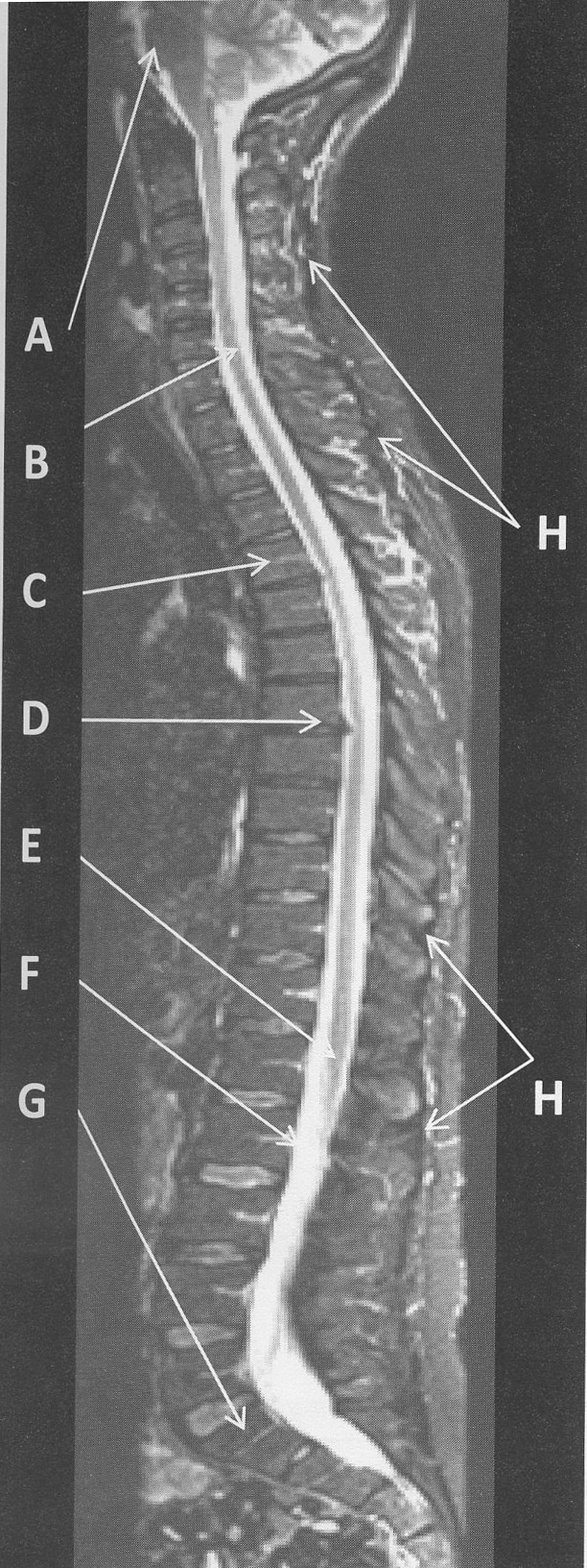 figure B 11 the low signal intensity area (arrows H) that runs superior and inferior but posterior to the spinous process represents