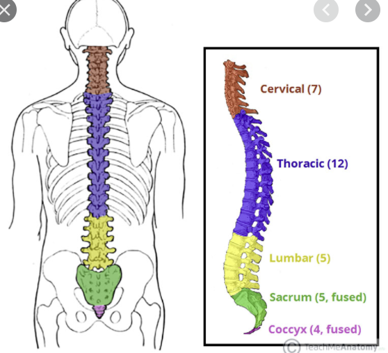Cervical, Thoracic, Lumbar, Sacrum, coccyx