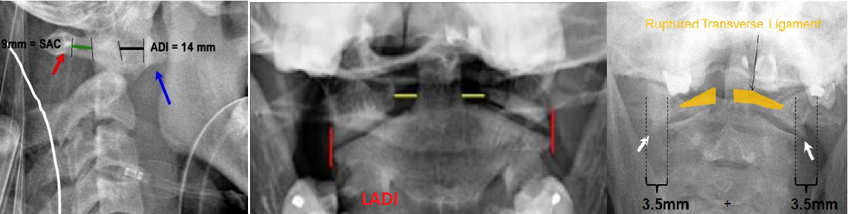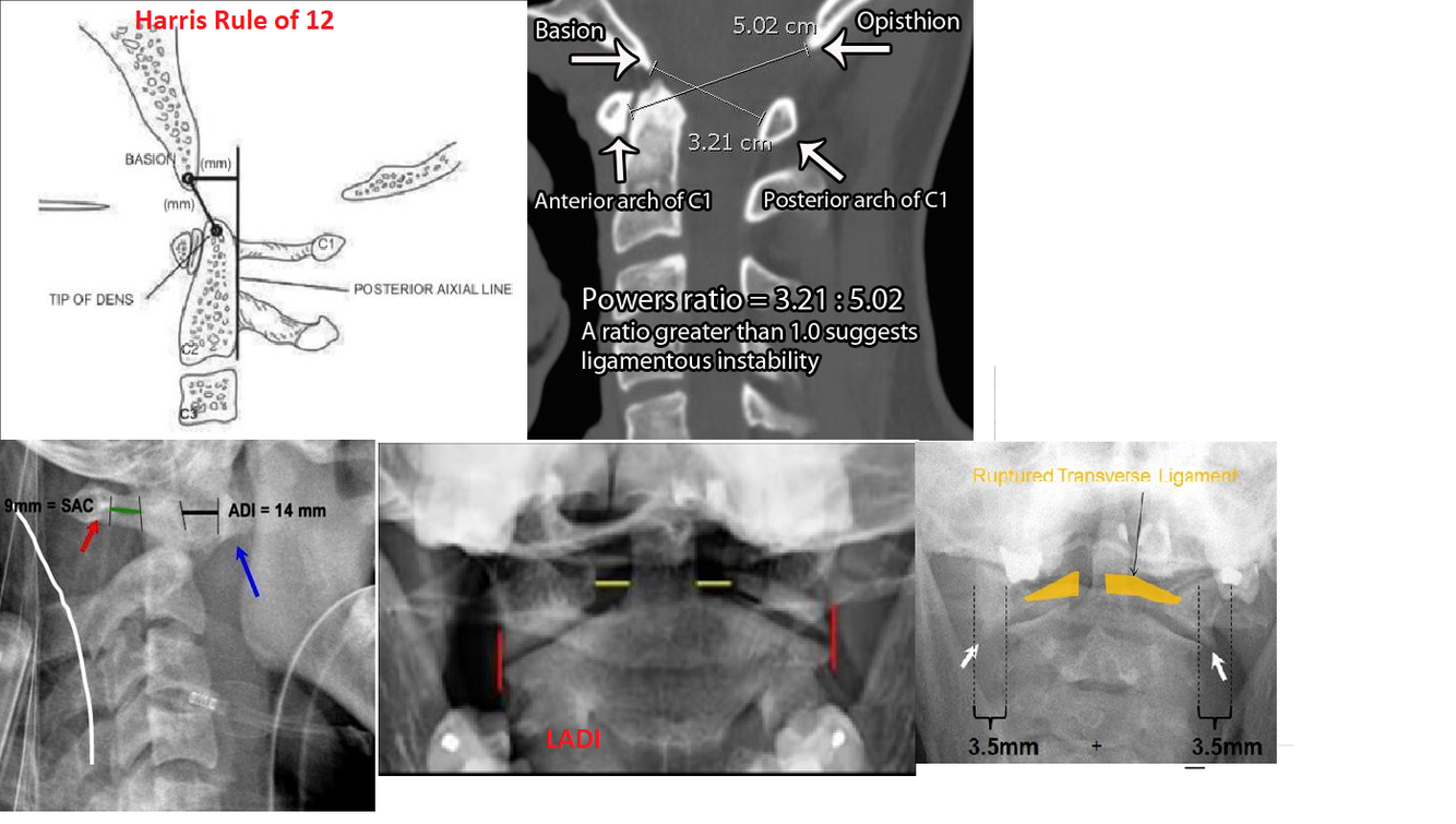 What are the radiographic parameters to assess for atlantoaxial instability?