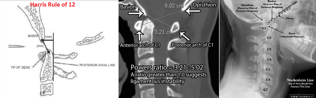 What are the radiographic parameters to be assessed on plain film for craniocervical dissociation?