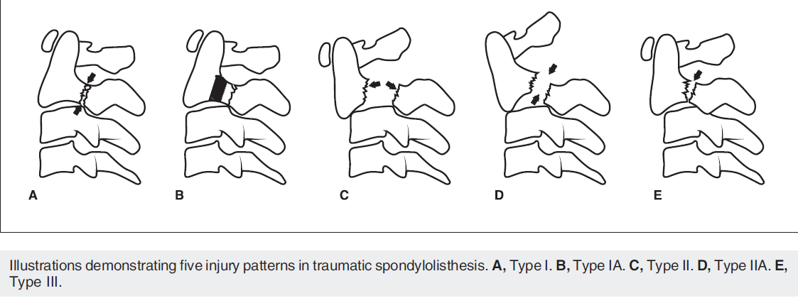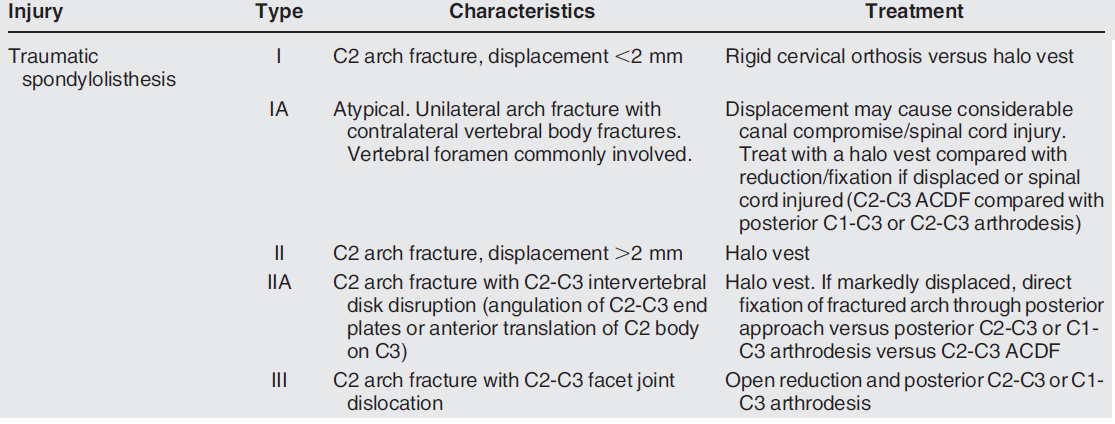 What is the classification for traumatic spondylolisthesis of the axis (Hangman’s Fracture)?