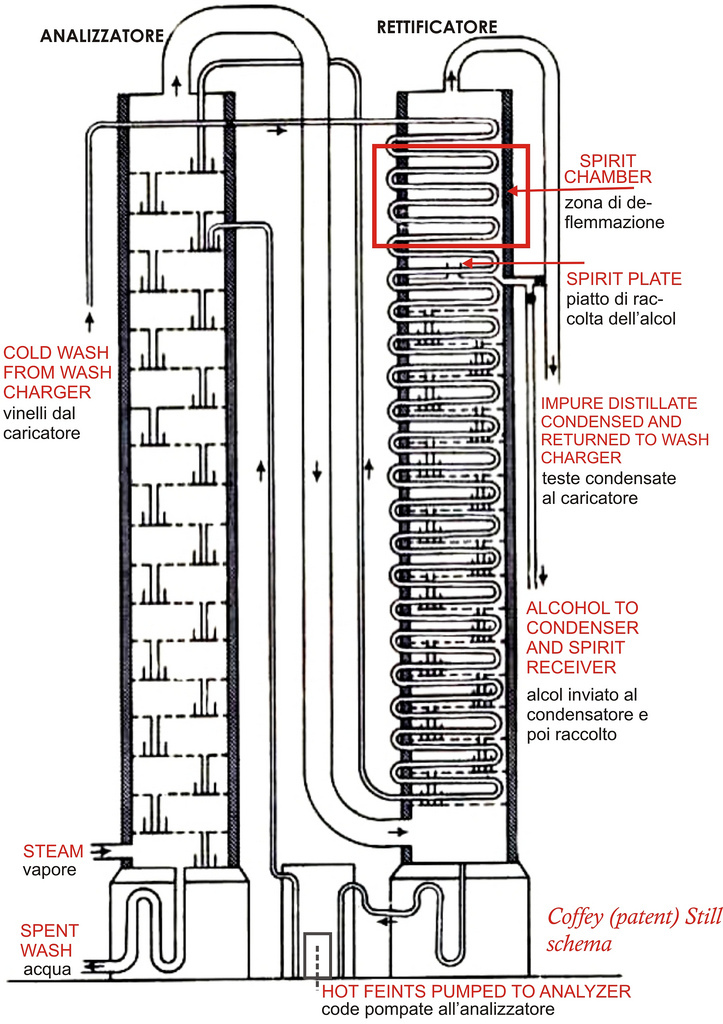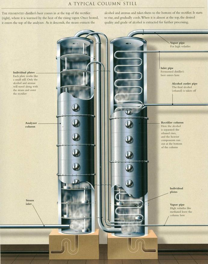 The alcohol is condensed in a purer fashion, stripping the alcohol of excess congeners and flavors, creating a higher-alcohol spirit