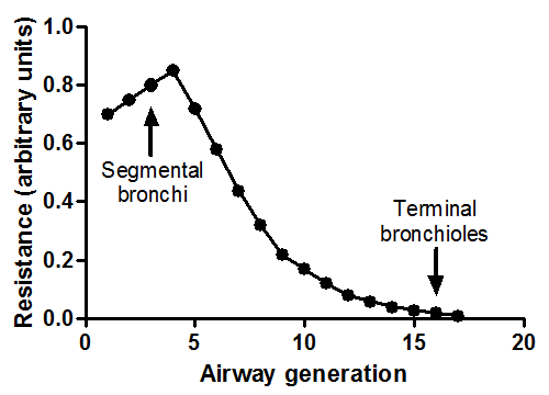 Key is HIGH resistance in the medium sized bronchi around 5-10 generations; less of a total cross sectional area. As we get to higher generations, resistance much lower