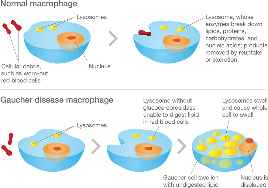 this will cause GLUCOCEREBRESIDE to accumulate in macrophages. these r known as GAUCHER cells. can cause SPLENOMEGALY