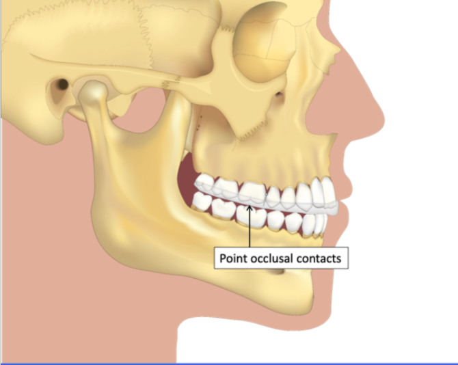 never use a partial coverage splint as the anteriors will over-erupt resulting in an open-bite