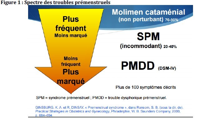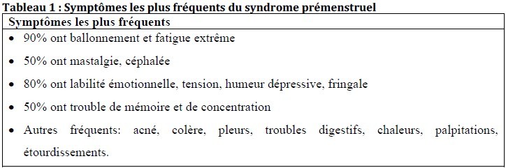Le syndrome prémenstruel est caractérisé par des symptômes à la fois physiques et comportementaux survenant de façon répétitive dans la deuxième partie du cycle menstruel uniquement et interférant avec les activités de la vie quotidienne.