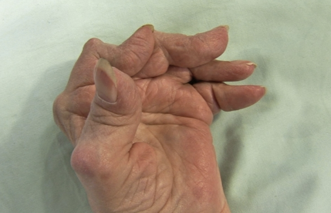 Picture illustrates Boutonniere deformity, ulnar deviation and Z-shaped thumb.